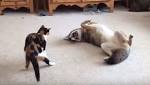 ‘遊んでほしくて。飼いならされたコヨーテ、大好きな猫の攻撃になすがまま’